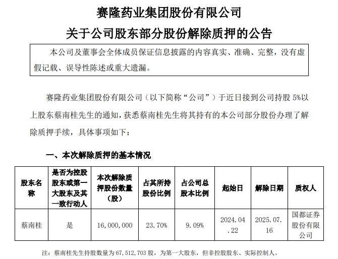 7月18日,*ST赛隆(002898)公告称,公司于近日接到公司持股5%以上股东蔡南桂的通知,获悉蔡南桂将其持有的本公司部分股份办理了解除质押手续,本次解除质押股数16,000,000股,占公司总股本比例9.09%。